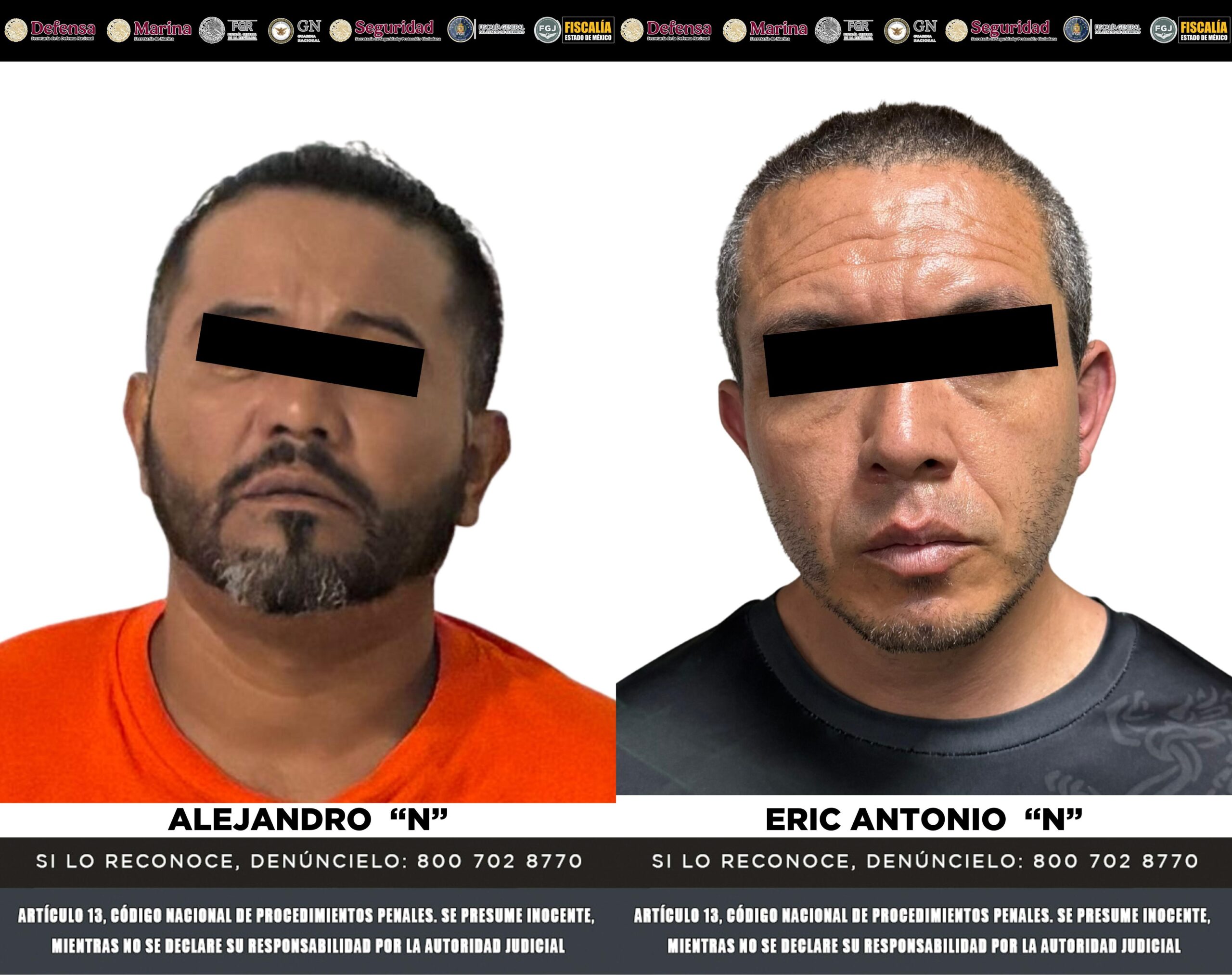 Con la información obtenida, se implementó un dispositivo de seguridad coordinado con las fiscalías estatales, mediante el cual fue detenido Eric Antonio “N”, quien cuenta con una orden de aprehensión vigente. En la misma acción fue detenido Alejandro “N”, quien lo auxilió a ocultarse y cuenta con una orden de aprehensión por el delito de abuso sexual en agravio de una menor, correspondiente a hechos ocurridos en 2022, en Cuautitlán, Estado de México.