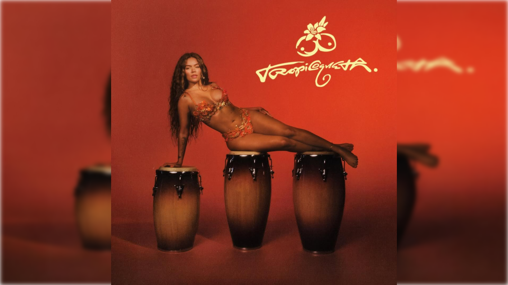 En lugar del clásico tocado de frutas, Karol opta por una estética propia: lleva bongós atados a la cintura, cocos como parte de su top, y un atuendo naranja brillante que remite al espíritu tropical.